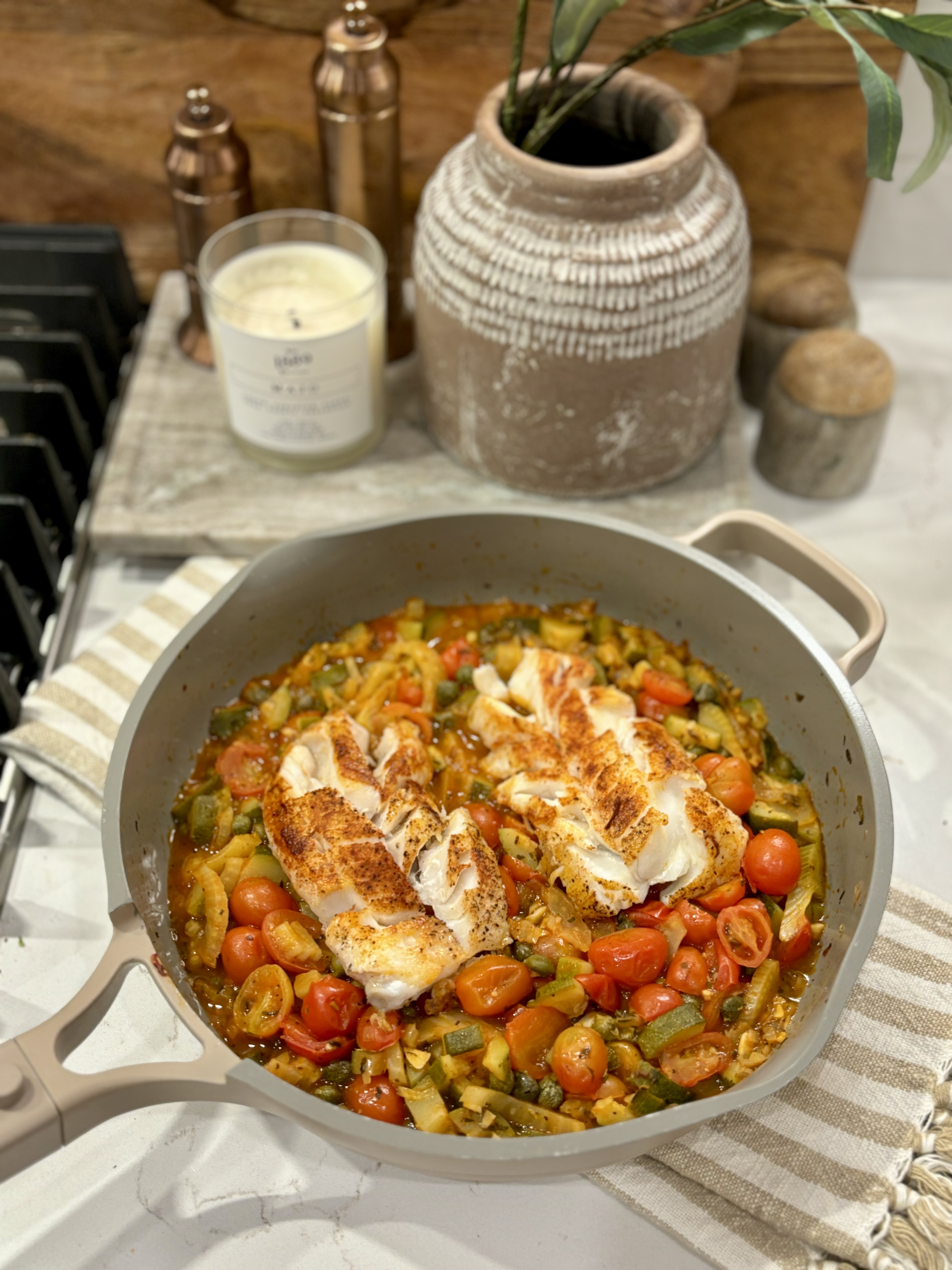 Directions: Prep vegetables, and season fish with salt, pepper, and sweet paprika. In a large saute pan on Medium heat, add in olive oil and butter to melt. Sear cod about 5-8 minutes each side until cooked through (145F) and remove from heat and cover for later. In the same pan over medium heat add in fennel, bell pepper, zucchini and cook for about 5 minutes until starting to soften. Add in onions and garlic and cook for another 5 minutes. Add in salt and pepper to taste, herbs de province, and tomato paste and combine. Add in cherry tomatoes, vegetable broth, capers and cover the pan and let simmer for about 10 minutes. After reduced down slightly, add cooked Cod to the top and enjoy!