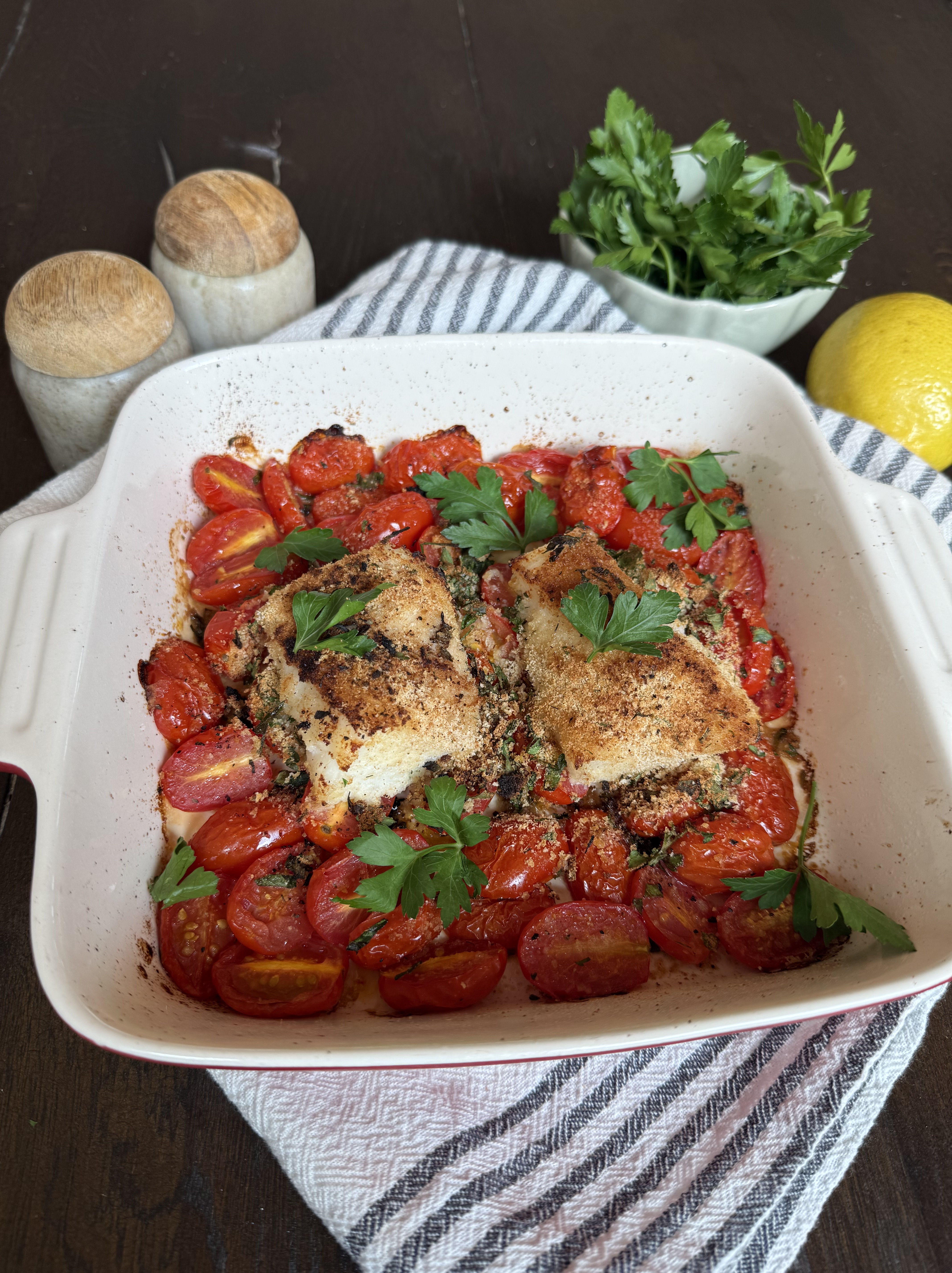Directions: Preheat oven to 400F. In a bowl combine the cherry tomatoes, olive oil, salt and pepper and place in a greased 8×8 baking dish. Season fish with salt and pepper and place over top tomatoes. In a small bowl combine chopped parsley, garlic, bread crumbs, and lemon zest and mix until combined. Pat mixture into the top of the fish. Sprinkle the rest over the tomatoes. Baked for about 20 minutes until tomatoes are cooked and fish internal temp is 145F. Enjoy!